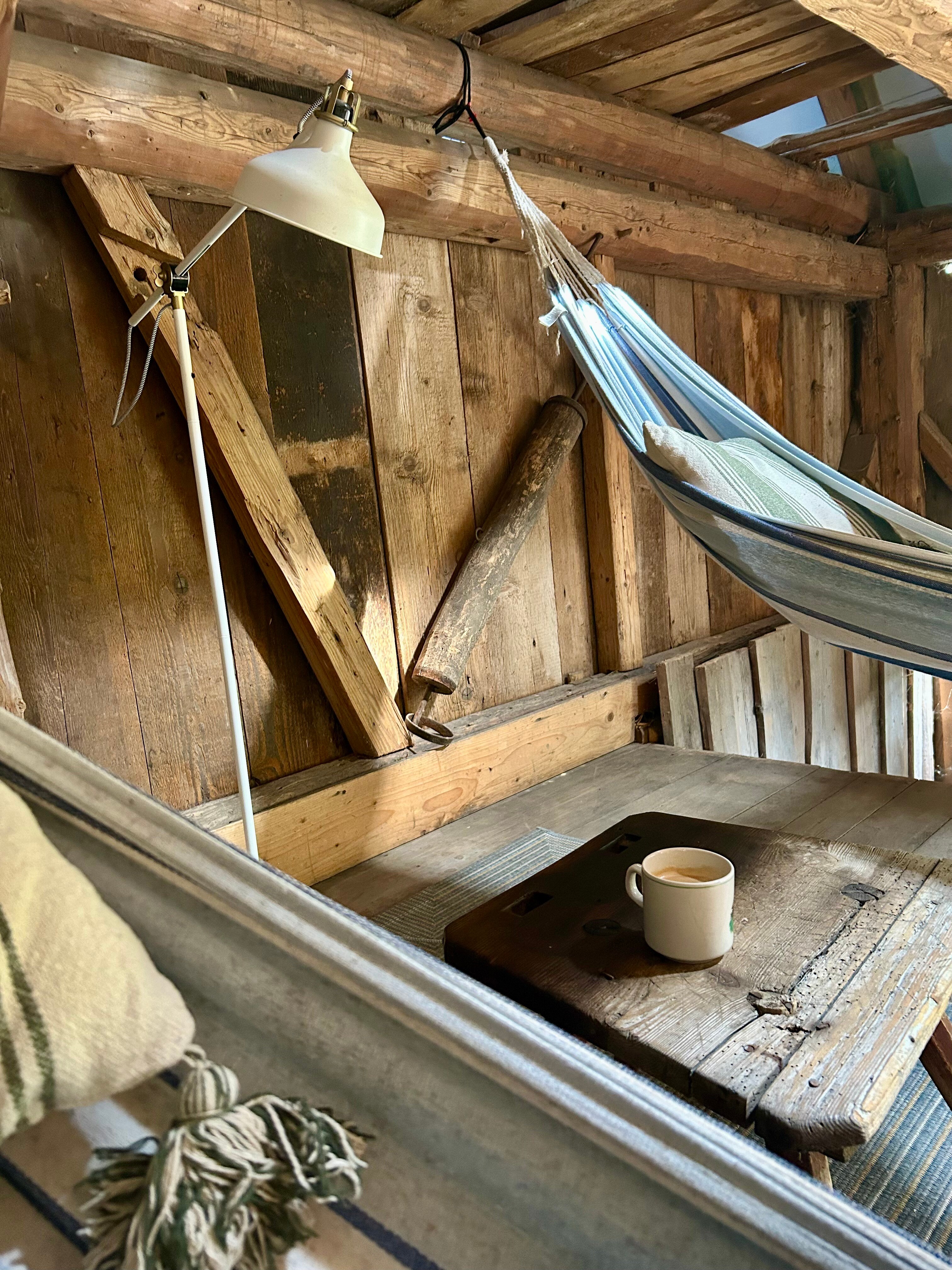Większa stodoła z widokiem na dom i podwórze znajdziecie tam dwie wiszące huśtawki, duży stół, miejsce do siedzenia, hamaki, książki puzzle. Wieczorem idealne miejsce żeby porozmawiać z przyjaciółmi ponieważ jest tam przyjemne nastrojowe światło.